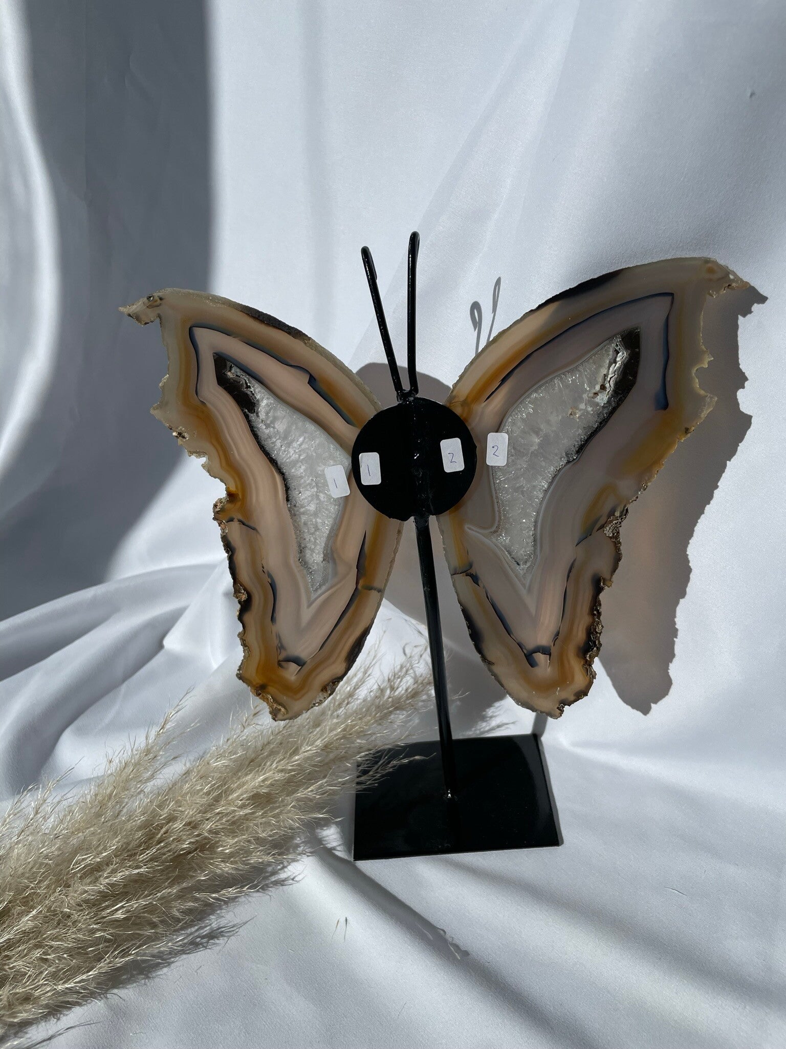 Agaat vlinder op standaard totaal hoogte van metalen voet naar punt vleugel is a 27cm en breedte ongeveer 24cm.