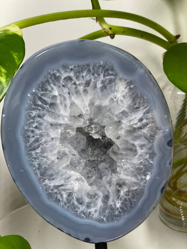 Hele mooie Agaat op standaard met mooie kristallen in het midden.