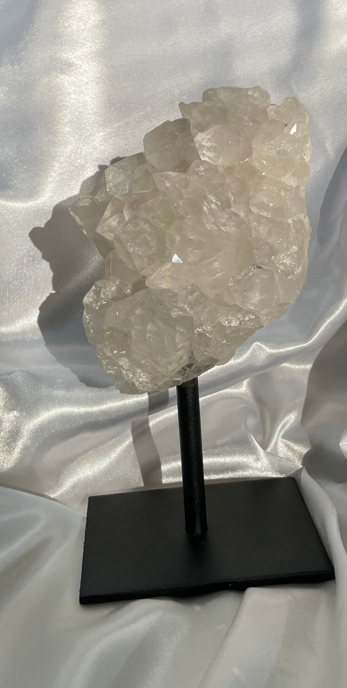 Hele mooie Bergkristal Cluster op standaard met mooie kristallen met regenboogtrui in het licht.