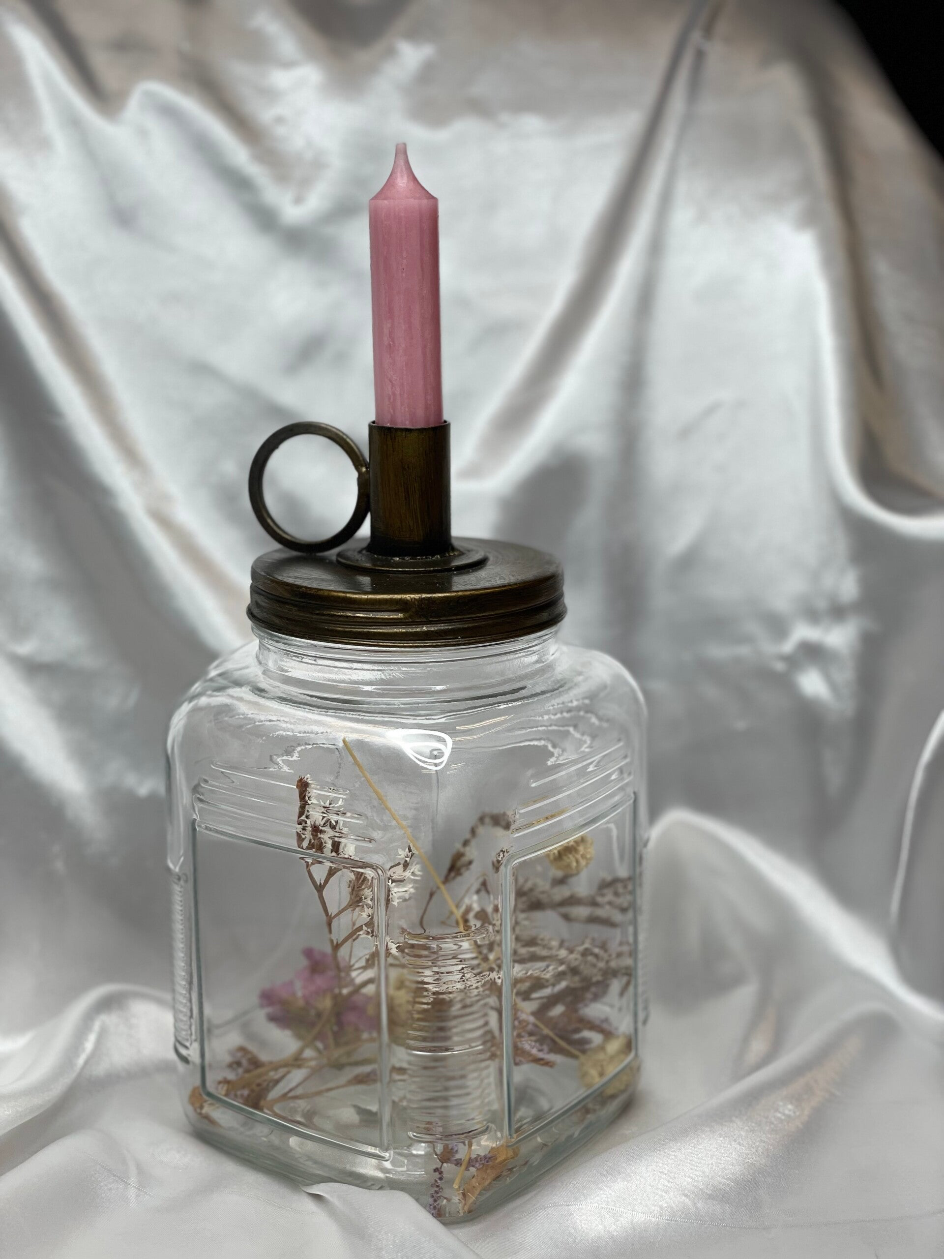 Glazen kandelaar met droogbloemen