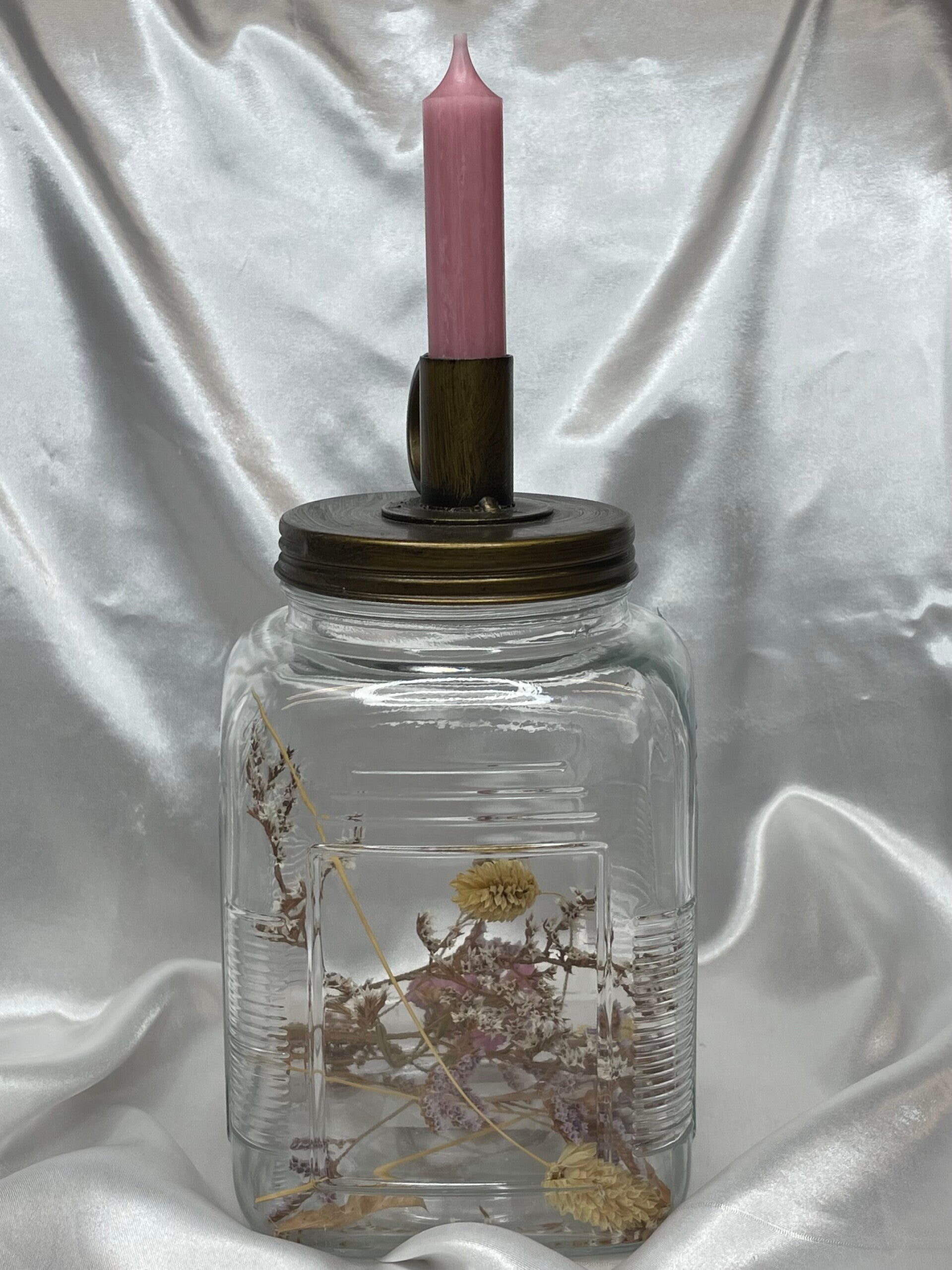 Glazen pot kandelaar met droogbloemen