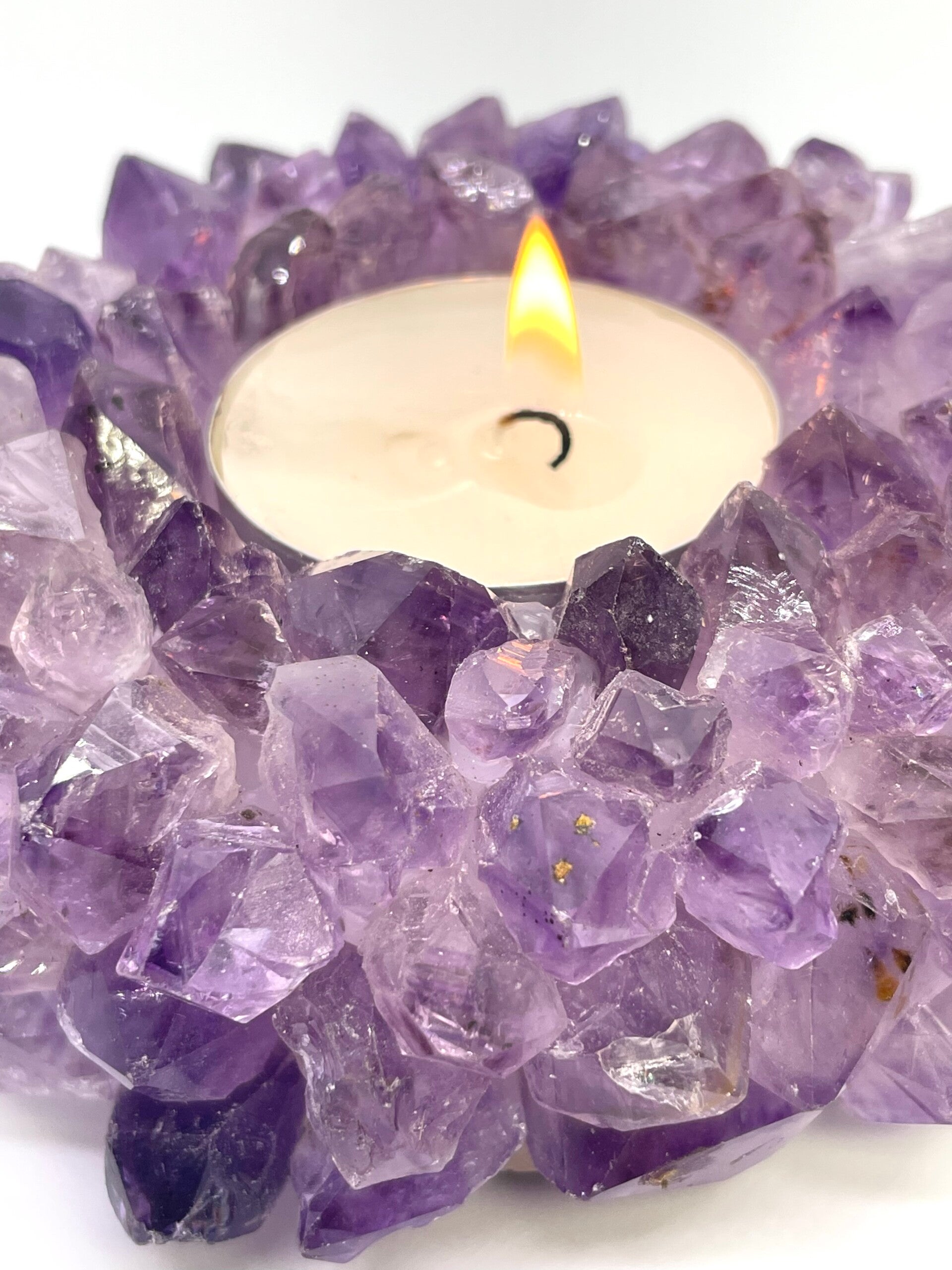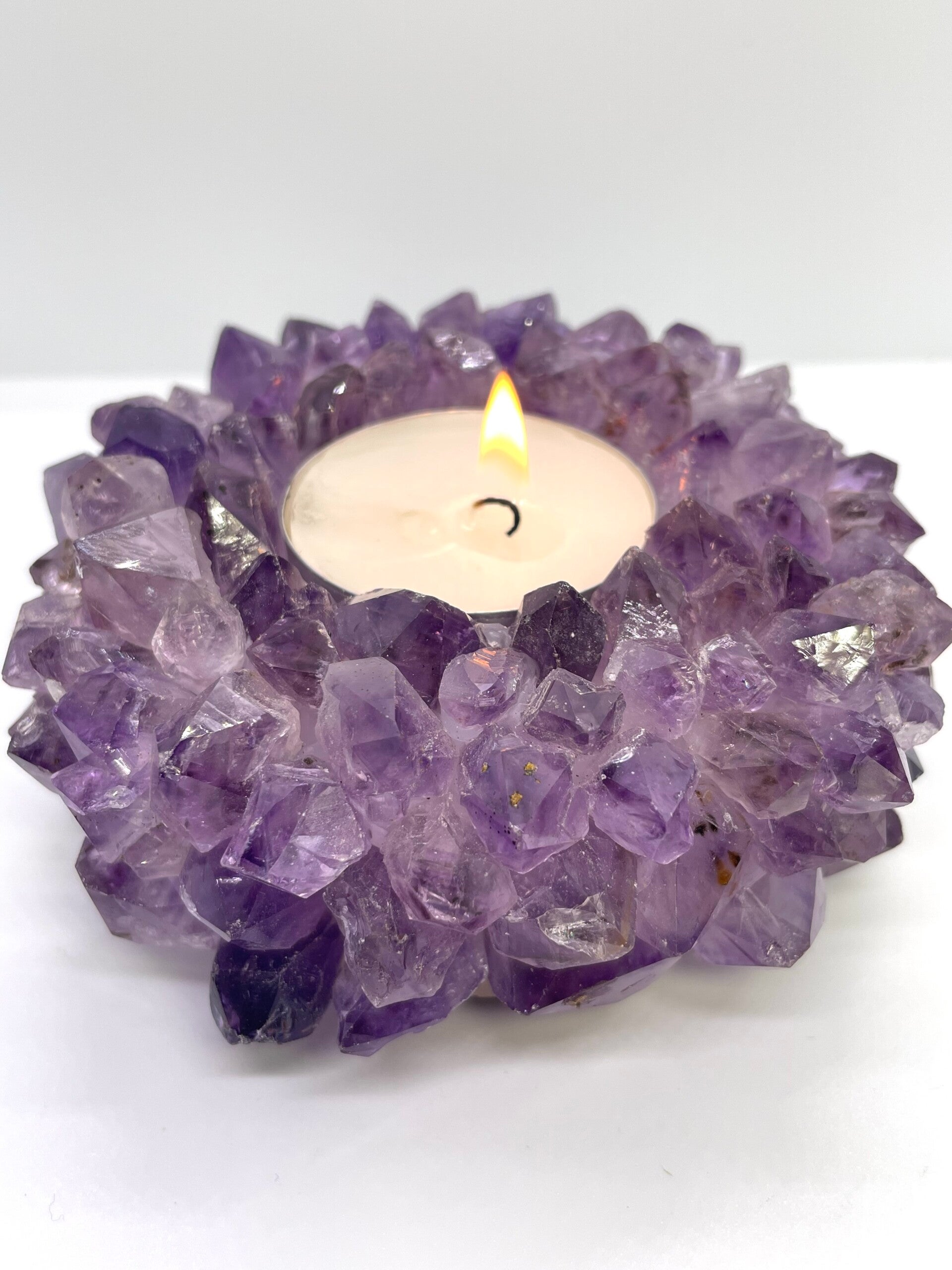 Hele mooie A kwaliteit Ametist theelichthouder met allemaal kristallen punten.